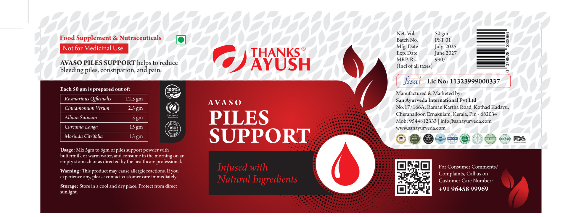- Mix 5 to 6 grams of Piles Support powder with buttermilk or warm water and consume it in the morning on an empty stomach, or as directed by a healthcare professional or Ayurvedic practitioner
